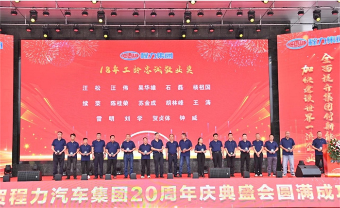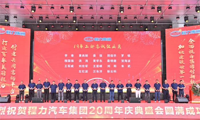 北汽福田汽車股份有限公司Y事業(yè)部總裁宋洋先生在致辭中,也全面回顧了福田與程力緊密合作的深厚友誼,對程力20年來的發(fā)展成就表示充分的肯定和由衷的贊許。北汽福田汽車股份有限公司助力程力在小卡、微卡實現(xiàn)行業(yè)引領,打造了標桿市場,市場份額達到70%,推動了細分市場的發(fā)展與創(chuàng)新;新冠疫情期間,江鈴汽車股份有限公司鼎力馳援、力保醫(yī)療救護車交付7000余臺,收到了國務院來信表揚。 江鈴汽車股份有限公司副總裁兼江鈴汽車銷售有限公司總經(jīng)理劉讓坡先生在致辭中,盤點了江鈴與程力兄弟般情誼的合作佳話。 除上述主機廠代表發(fā)言外,程力與一汽解放、東風商用車、安徽江淮、長安凱程、南京依維柯、陜汽集團、東風隨專、上汽大通、成都壹為、三環(huán)汽車等合作單位,先后聯(lián)袂打造了航天醫(yī)監(jiān)醫(yī)保車、應急救險車等眾多的成功合作案例,正是各位底盤合作單位的鼎力相助,我們將天馬行空的設計理念轉化為馳騁路面的各類專用車輛,讓每一款改裝作品都閃耀著獨特的光芒,成為行業(yè)內(nèi)的佼佼者。 襄陽達安汽車檢測中心有限公司副總經(jīng)理齊剛先生致辭。程力公司自建廠以來,與襄陽達安檢測中心展開合作。作為國家級的檢測機構,襄陽達安在公告、環(huán)保、營運等檢測認證,以及檢測場地、專家團隊等諸多方面,都給予了我們強有力的支持,特別是今年襄陽達安隨州專用汽車和應急裝備試驗場投入運營,更是助力隨州汽車企業(yè)的發(fā)展。程力一路走來,離不開襄陽達安的支持和幫助,在此對襄陽達安檢測中心表示衷心的感謝! 賡即,集團公司董事局主席程道國、董事長程阿羅向來自全國參加慶賀的主機廠代表贈予了程力20年“合作紀念獎”獎章。 程力汽車集團副總經(jīng)理倪文進(左)向檢測機構襄陽達安汽車檢測中心有限公司、中汽研汽車檢驗中心(武漢)有限公司代表,贈予了程力20年“合作紀念獎”獎章。 民族品牌,唱響世界。程力不僅是中國的程力,也是世界的程力;程力集團在湖北省建有五大核心制造基地,在立足本地的同時,我們用市外聯(lián)營模式走向全國走向世界,已成為行業(yè)的楷模和榜樣。這一成就典范的背后,離不開程力市外聯(lián)營單位的突出貢獻,我們的市外聯(lián)營合作伙伴,憑借出色的業(yè)務成果、創(chuàng)新的合作模式,以及深遠的對外影響力,在眾多單位中脫穎而出,程力集團總經(jīng)理朱武(右)向全國6家市外聯(lián)營單位的代表頒發(fā)了“程力20周年紀念獎”獎章。 程力集團銷售總公司常務副總經(jīng)理袁美玲(左)向全國共9家服務站及直營店代表頒發(fā)了“程力20年紀念獎”獎章。這些在奮戰(zhàn)銷售第一線的直營店,以及售后領域默默耕耘的服務站,他們用不懈的努力和專業(yè)的態(tài)度贏得了口碑,他們辛勤的付出,為程力產(chǎn)品的銷售與服務做出了巨大貢獻。 二十年比肩同行,二十年披星戴月,二十年同舟共濟,我們更要感恩程力專業(yè)廠、直屬廠的辛勤付出和默默奉獻。程力集團黨委書記袁昌才、總經(jīng)理朱武,為默默耕耘8年以上的生產(chǎn)經(jīng)營單位共負責人頒發(fā)了“程力20周年紀念獎”獎章。 集團公司的發(fā)展離不開最早的一批創(chuàng)業(yè)者,雖然他們已經(jīng)退休,但仍然無時無刻關注著集團的發(fā)展。他們在公司工作都超過15年,為集團的發(fā)展作出了巨大的貢獻,集團董事局常務副主席程國強為光榮退休忠誠敬業(yè)獎老員工頒發(fā)了獎章。 當我們攜起手來,總有溫暖的臂膀在支撐;一代一代程力人薪火相傳,兢兢業(yè)業(yè),開拓創(chuàng)新,奮發(fā)圖強,鑄就了今日輝煌,程力汽車集團公司為15年至18年工齡獲得忠頒發(fā)了誠敬業(yè)獎。 集團董事局常務副主席程國強、集團董事局副主席郭傳文、集團董事局副主席黃尚財、集團董事局委員廖明洲、集團董事局辦公室主任楊祖國為獲獎人員頒獎,并合影留念。 集團董事局主席程道國、集團董事長程阿羅為19年及20年工齡的忠誠敬業(yè)獎獲獎者頒獎,并合影留念。頒獎現(xiàn)場一陣陣熱烈的掌聲,表達了對程力忠誠敬業(yè)的員工們表示衷心的感謝,正是有了廣大員工在公司忠誠堅守,程力才有一代一代的賡續(xù)傳承和輝煌成就! 二十年來,程力堅持創(chuàng)新驅動,不斷推進技術進步和產(chǎn)品升級。從最初的單一產(chǎn)品,到如今涵蓋各類專用汽車、新能源汽車及關鍵零部件的完整產(chǎn)業(yè)鏈,程力汽車集團已成為國內(nèi)領先的綜合性汽車產(chǎn)業(yè)集團。為更好詮釋企業(yè)文化、企業(yè)發(fā)展方向,站在新的歷史起點上,讓企業(yè)品牌享譽世界,我們將發(fā)布程力集團的國際化品牌logo,有請程力汽車集團黨委書記袁昌才,帶領余操、呂仁波、廖朝鳳、陳垚東、梁沙艾、陳永有等6位國際貿(mào)易總公司銷售部負責人,共同點亮程力集團的全球化品牌logo。程力國際化品牌logo的發(fā)布,預示著程力國際化加快了步伐,程力必將成為一流的國際化公司和世界名牌企業(yè)。 程力人有擔當,初心不忘;民族品牌大國工匠,深耕沃土實干興邦。新廠歌,有力量,激勵我們奮發(fā)向上,攜手再創(chuàng)新輝煌。有請程力汽車集團黨委書記袁昌才,帶領集團副總經(jīng)理倪文濤、周厚山、劉峰,集團總經(jīng)