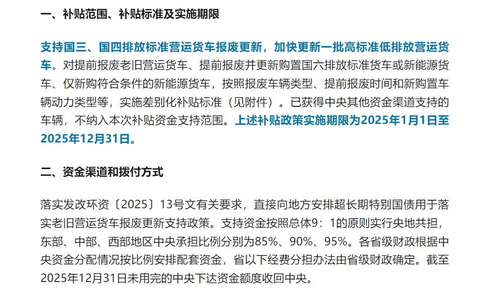 3月14日 深圳啟動(dòng)以舊換新實(shí)施方案 深圳市發(fā)展和改革委員會(huì)、深圳市財(cái)政局關(guān)于印發(fā)2025年超長期特別國債資金加力擴(kuò)圍支持消費(fèi)品以舊換新實(shí)施方案的通知 ,明確指出,在2024年政策基礎(chǔ)上,將老舊營運(yùn)貨車報(bào)廢更新補(bǔ)貼范圍擴(kuò)大至國四排放標(biāo)準(zhǔn)營運(yùn)貨車。對提前報(bào)廢國四及以下排放標(biāo)準(zhǔn)營運(yùn)柴油貨車,平均每輛補(bǔ)貼3萬元;提前報(bào)廢并新購國六排放標(biāo)準(zhǔn)貨車或新能源貨車,平均每輛補(bǔ)貼8萬元;僅新購新能源城市冷鏈配送貨車,每輛補(bǔ)貼3.5萬元。