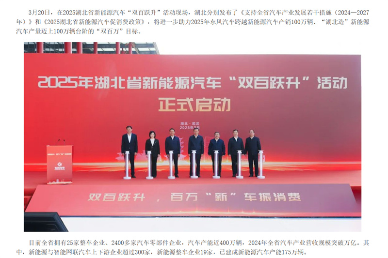 3月19日 (下午)三部門聯(lián)合升級貨車更新政策:交通運(yùn)輸部、發(fā)改委、財(cái)政部將老舊貨車補(bǔ)貼范圍擴(kuò)展至國三/國四排放車輛,取消燃料類型限制。根據(jù)新規(guī),提前報(bào)廢并更換新能源貨車的企業(yè)最高可獲14萬元/車補(bǔ)貼,購置國六車型補(bǔ)貼7萬元。政策特別設(shè)置"綠色通道",對參與氫燃料電池車示范運(yùn)營的企業(yè)額外給予3萬元運(yùn)營補(bǔ)貼。支持資金按照總體9:1的原則實(shí)行央地共擔(dān)。 3月20日 湖北省確定汽車產(chǎn)業(yè)“雙百萬”目標(biāo) 湖北省分別發(fā)布了《支持全省汽車產(chǎn)業(yè)發(fā)展若干措施(2024—2027年)》和《2025湖北省新能源汽車促消費(fèi)政策》,將進(jìn)一步助力2025年“湖北造”新能源汽車產(chǎn)量邁上100萬輛臺(tái)階的目標(biāo)。 3月21日 大同構(gòu)建新能源商用車生態(tài)圈 3月29日 央企重組開啟產(chǎn)業(yè)新格局 3月,財(cái)政部的扶持政策不僅延長了購置稅減免期限,還加大了對充換電基礎(chǔ)設(shè)施和智能網(wǎng)聯(lián)技術(shù)的投入,為新能源專用車的市場推廣和基礎(chǔ)設(shè)施建設(shè)提供了有力保障。此外,三部門聯(lián)合升級的貨車更新政策,提供了豐厚的補(bǔ)貼,將促進(jìn)新能源專用車的銷售。湖北省確定汽車產(chǎn)業(yè)“雙百萬”目標(biāo)不僅為當(dāng)?shù)?/span>提供了政策支持和市場需求保障,還促進(jìn)了產(chǎn)業(yè)鏈的協(xié)同發(fā)展和新能源專用車的普及推廣。這一系列政策將有助于推動(dòng)新能源專用車產(chǎn)業(yè)的快速發(fā)展和壯大。 |