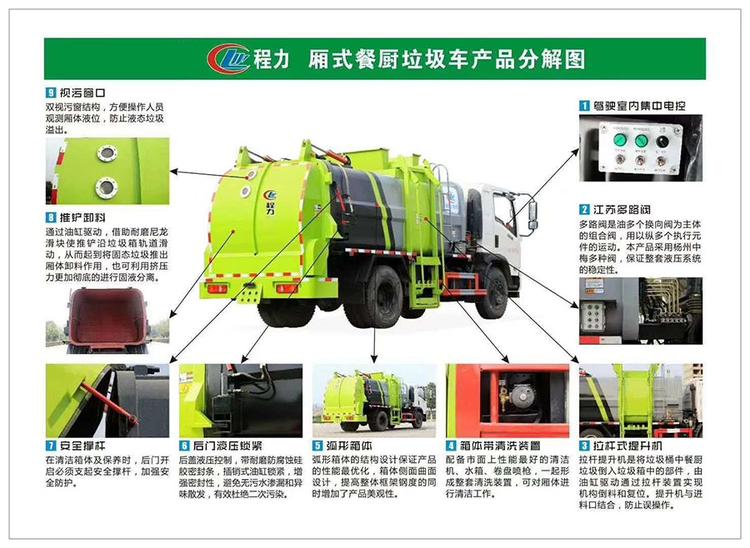 湖北程力國六東風(fēng)天錦10-12方餐廚垃圾車(方罐)程力威牌CLW5160TCA6SL型餐廚垃圾車廠家配置: