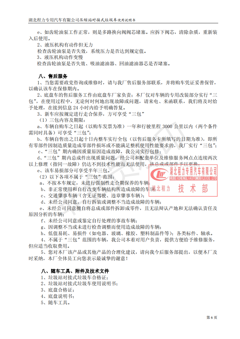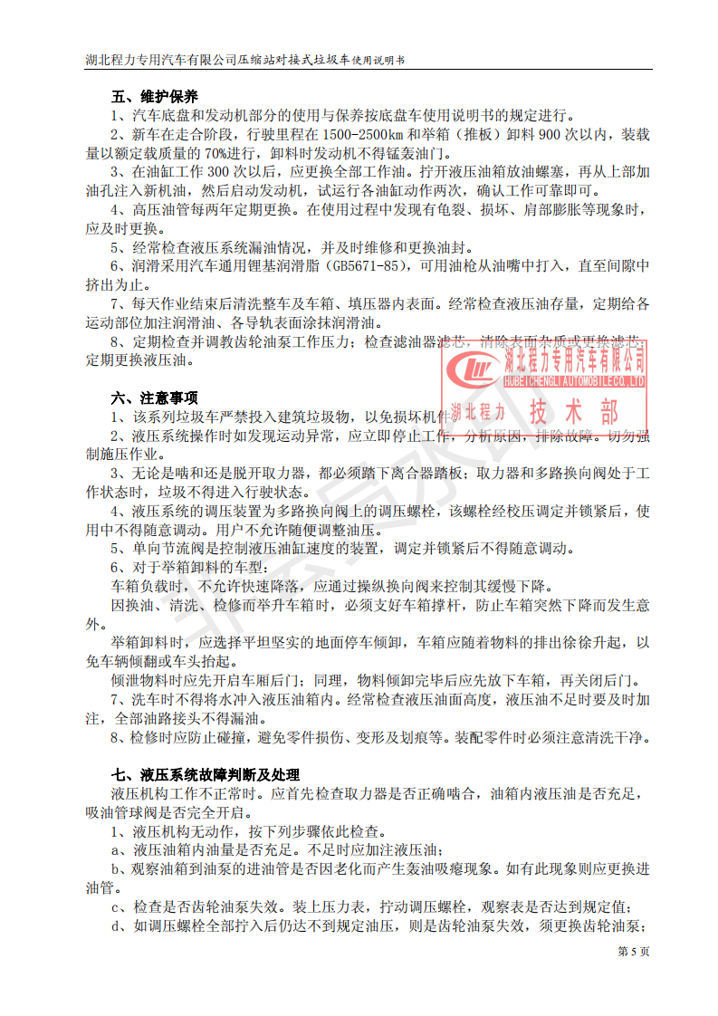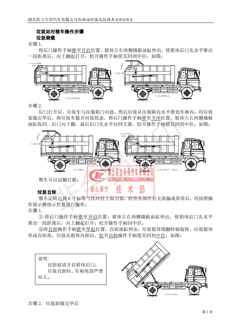 湖北程力垃圾壓縮站對(duì)接式垃圾車使用操作說(shuō)明書(shū)