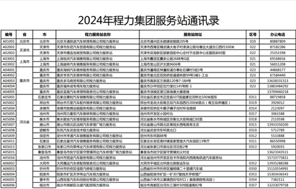 2、配件只收工本費,不加其他費用; 三、產品底盤故障,請按底盤廠家在就近服務站維修,具體地址詳見隨車發(fā)送的底盤服務站名錄或直接撥打電話查詢。 程力汽車公司竭誠為您服務。 24小時售后服務電話:0722-3816599 程力專用汽車股份有限公司(程力威)牌專用汽車全國服務站名錄如下: 程力汽車北京、天津、上海、重慶、河北、山西服務站通訊錄: