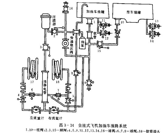 飛機(jī)加油車(chē) (1)飛機(jī)加油的特殊要求,飛機(jī)加油車(chē)在總體上與普通加油車(chē)基本相同,但結(jié)構(gòu)上還有特殊要求。 ①加油壓力穩(wěn)定性要求高,為此在加油管路上加裝壓力調(diào)節(jié)器,穩(wěn)壓器和壓力加油接冰在。 ②油料的潔凈度高。油路上要用高性能的過(guò)濾分離器。罐體和管道必須采用鋁合金制造。 ③絕對(duì)保證加油安全性。應(yīng)安裝消靜電裝置,聯(lián)鎖控制系統(tǒng)、電氣防爆器、滅火器等。 ④裝有高精度,大流量的計(jì)量器。 ⑤油罐總?cè)萘看,給飛機(jī)加油要一次完成。 (2)飛機(jī)加油車(chē)特殊要求的主要部件 ①旁通穩(wěn)壓閥。給飛機(jī)加油,一般采取底部閉式加油,要求加油車(chē)具有穩(wěn)定的管端壓力,通常為0.343MPa,而對(duì)車(chē)輛加油則不要求管端壓力。一般在油泵上并聯(lián)旁穩(wěn)壓閥,在絞盤(pán)后的出油管路上串聯(lián)壓力補(bǔ)償器。圖3-34為全掛式飛機(jī)加油車(chē)油路系統(tǒng)圖,油泵上并聯(lián)有旁通穩(wěn)壓閥,其調(diào)定壓力為油泵的工作壓力,由管端壓力和管路的壓力損失確定。圖3-35 為旁通穩(wěn)壓閥的工作原理圖。氣室1內(nèi)充有一定壓力的空氣,上部油室2與泵的出口高壓油相通,氣室活塞3、油室活塞4與閥門(mén)5連成一體。在泵正常工用壓力下,氣室的氣體對(duì)活塞3的推力F1與油室油液對(duì)活塞4的推力F2相等,閥門(mén)5關(guān)閉不動(dòng),當(dāng)泵出口壓力升高時(shí),油室的壓力隨之升高,F(xiàn)2> F1,活塞在力F=F2-F1的作用下推動(dòng)閥5下移,閥門(mén)被打開(kāi),泵的出口與入口油路接通,系統(tǒng)壓力被打開(kāi),泵的出口與入口油路接通,系統(tǒng)壓力開(kāi)始下降,直至恢復(fù)原工作壓力,閥門(mén)又呈關(guān)閉狀態(tài)。 ②過(guò)濾分離器,為了獲得高潔凈度燃油,在管路中需加裝高性能的過(guò)濾分離器,將油中的水分,膠質(zhì)和雜質(zhì)分離出來(lái),圖3-36為兩級(jí)過(guò)濾分離器。第一級(jí)濾芯2為聚結(jié)濾芯,由經(jīng)過(guò)特殊處理的濾紙或玻璃纖維,合成材料,毛氈、棉織品等制成。油流經(jīng)濾芯時(shí),首先濾出的固體物質(zhì),再將膠質(zhì)分離,同時(shí)將分離出的小水粒聚集成大水滴,落入由外殼形成的集水器中,第二級(jí)濾芯1為分離器濾芯,表面涂有聚四氟乙烯的表面滑下,滴入集水池中,達(dá)到徹底分離水的作用。