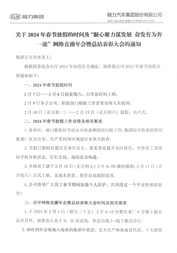 程力汽車集團關(guān)于2024年春節(jié)放假的時間及”網(wǎng)絡(luò)直播年會暨總結(jié)表彰大會的通知