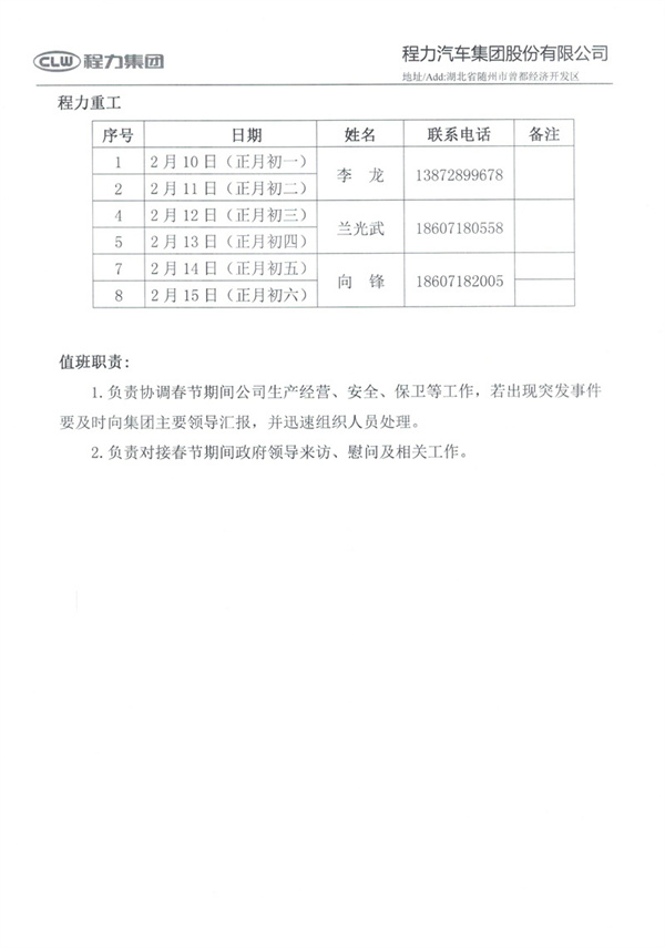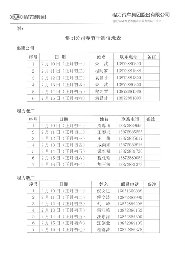 程力汽車集團股份有限公司關(guān)于2024年春節(jié)放假的時間及“凝心聚力謀發(fā)展奮發(fā)有為奔 一流”網(wǎng)絡(luò)直播年會暨總結(jié)表彰大會的通知 程力集團公司全體員工: 根據(jù)國務(wù)院辦公廳2024年放假有關(guān)規(guī)定,現(xiàn)將程力汽車集團公司2024年春節(jié)放假安排通知如下: 一、2024年春節(jié)放假時間 2月7日--2月8日按星期六、日作息時間上班; 2月9日各子公司、職能部門根據(jù)工作需要安排人員值班; 2月10日(正月初一)一-2月15日(正月初六)放假,共六天。 二、2024年春節(jié)放假工作安排及相關(guān)要求 1.各單位、部門要做好節(jié)前安全檢查和清潔掃除工作,集團綜合檢查組將對 新老廠區(qū)辦公室、生產(chǎn)車間等區(qū)域進行安全大檢查。 2.節(jié)假日期間若遇突發(fā)事件發(fā)生,要妥善處置并及時報告;全體員工須保持手機開機狀態(tài),釘釘在線,確保聯(lián)系暢通。 3.全體員工請于2月16日(正月初七)上午9:00準時報到,2月17日(正月初八)正式上班,無故未到者,將作自動離職處理。 4.公司倡導廣大員工春節(jié)期間加強個人防護,共同度過一個平安祥和的春節(jié)! 三、召開網(wǎng)絡(luò)直播年會暨總結(jié)表彰大會時間及相關(guān)要求 1.于2024年2月4日(臘月二十五)上午9:18分整在老廠6號樓2樓會 議室召開,請參會人員于8:50前進場,年會以線上+線下模式舉行。 2.請收到年會現(xiàn)場入場券的集團中高層、五大生產(chǎn)體系成員代表、十大銷售體系成員代表,統(tǒng)一著工作服(由于當天氣溫較低大家?guī)虾竦耐馓?,憑入 場券入場。 3.不能參加現(xiàn)場年會的同事,關(guān)注程力集團抖音發(fā)布官方號:CLJTDYGFH001 觀看直播。 提前祝大家春節(jié)愉快、身體健康、萬事順意!附圖: ![]() ![]() ![]() ![]() |