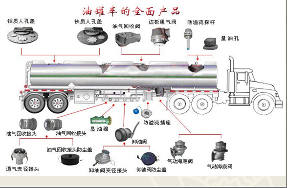 (1)海底閥:又稱緊急切斷閥,安裝于罐體底部,進(jìn)行下裝加油時(shí)使用,在油罐發(fā)生意外時(shí),由于斷槽處于無(wú)法承載過(guò)大沖力,車體管路與罐體會(huì)自動(dòng)斷開,而自動(dòng)對(duì)中柱塞和耐用彈簧會(huì)依舊保持密封,罐內(nèi)介質(zhì)不會(huì)泄漏,從而保證油罐安全。 (2)油氣回系統(tǒng):①油氣回收閥:是將在裝卸油料時(shí)所產(chǎn)生的油氣回收的一種裝置,可以直接安裝在油罐車頂部罐體上,避免了油氣外泄。 ②油氣回收接頭:罐車油氣回收系統(tǒng)組成一個(gè)封閉的循環(huán)系統(tǒng),有效的將在油站加油過(guò)程中產(chǎn)生的油氣回收再利用,避免了油氣擴(kuò)散
