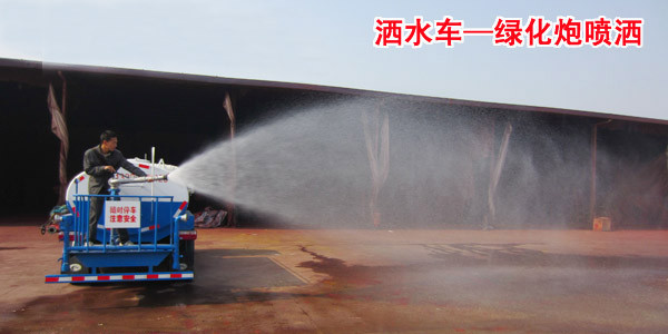 多功能灑水車帶前沖、后灑、帶側(cè)噴、帶后工作平臺(tái)。灑水車后工作平臺(tái)上安裝綠化灑水高炮。高炮可360°旋轉(zhuǎn),可連續(xù)調(diào)成直沖狀、大雨、小雨、毛毛雨、霧狀等多種形態(tài),并配備專用大功率灑水泵,帶消防接頭,帶自流閥,帶自吸功能。灑水車垂直吸程≥6米,灑水寬度≥14米,高炮射程≥28米。 下面,我們以東風(fēng)多利卡灑水車為例,依次為您展示灑水車噴灑、沖洗等全部功能: ◆ 灑水車前沖圖片:前沖為最常用的灑水車功能之一,常用于環(huán)衛(wèi)道路沖洗、壓塵、降溫等,平時(shí)我們見到的公路灑水車即是用的這一路面沖洗功能。
