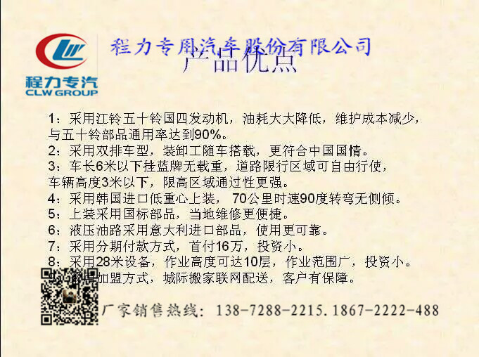 湖北程力公司生產(chǎn)的云梯搬家車的梯臂采用韓國整裝進口,因為韓國的搬家服務發(fā)展比較早,已經(jīng)有了非常優(yōu)質(zhì)的服務和成熟的云梯技術(shù)。進口品牌的最大的優(yōu)點在于質(zhì)量穩(wěn)定、經(jīng)驗豐富、技術(shù)過關(guān)。再結(jié)合國內(nèi)使用情況,進行了適當?shù)恼{(diào)整和優(yōu)化,使之更適用于中國國情。云梯搬家車的云梯單次載重400公斤,作業(yè)高度28米,可以用于工程租賃,幕墻施工、樓頂太陽能、樓頂防水作業(yè),廣告高炮,電力維修,空調(diào)室外機安裝,船舶維護,搬家公司,水泥沙子搬運,路橋修護等多種功能。藍色牌照,C證駕駛,無需特種操作證。 (1)云梯采用韓國進口技術(shù),部分部件采用韓國原廠整裝進口!另外,我公司通過引進、消化、改進,不斷完善云梯車的性能,也可根據(jù)客戶需求進行加裝,改進各項技術(shù)。 (2)公司在現(xiàn)有云梯基礎(chǔ)上研發(fā)出可以運送沙子的自卸貨斗。沙子運送到樓上以后貨斗自動傾斜將貨斗內(nèi)的沙子卸下,這樣降低了我們的勞動成本,同時也節(jié)省了勞動時間。讓我們可以有更多的時間賺取更多的利潤。另外也有普通運貨貨斗可供選擇。 (3)配備80米無線遙控系統(tǒng)。夏天可以躲在陰涼處坐著板凳操作,運送水泥等粉塵多的作業(yè)時,也能遠離粉塵的吸入,工作視線一目了然。如果包天干活,沒有遙控操作系統(tǒng),操作人員要站著一天,仰視著貨斗確實太辛苦。80米無線遙控包括整車啟動,貨斗升降,到達指定位置自動停止和液壓預熱器開關(guān)等。 (4)升降貨斗可以直達地面。大大的節(jié)省了人力,使作業(yè)更高效。另外貨斗展開后長寬為2m*2.4m?梢苑泡^大體積的貨物。 相信品牌,相信 程力。我公司生產(chǎn)的云梯搬家車故障率低,操作更簡潔?旖莅徇\搬家選云梯搬家車,讓您賺錢更好,更快!