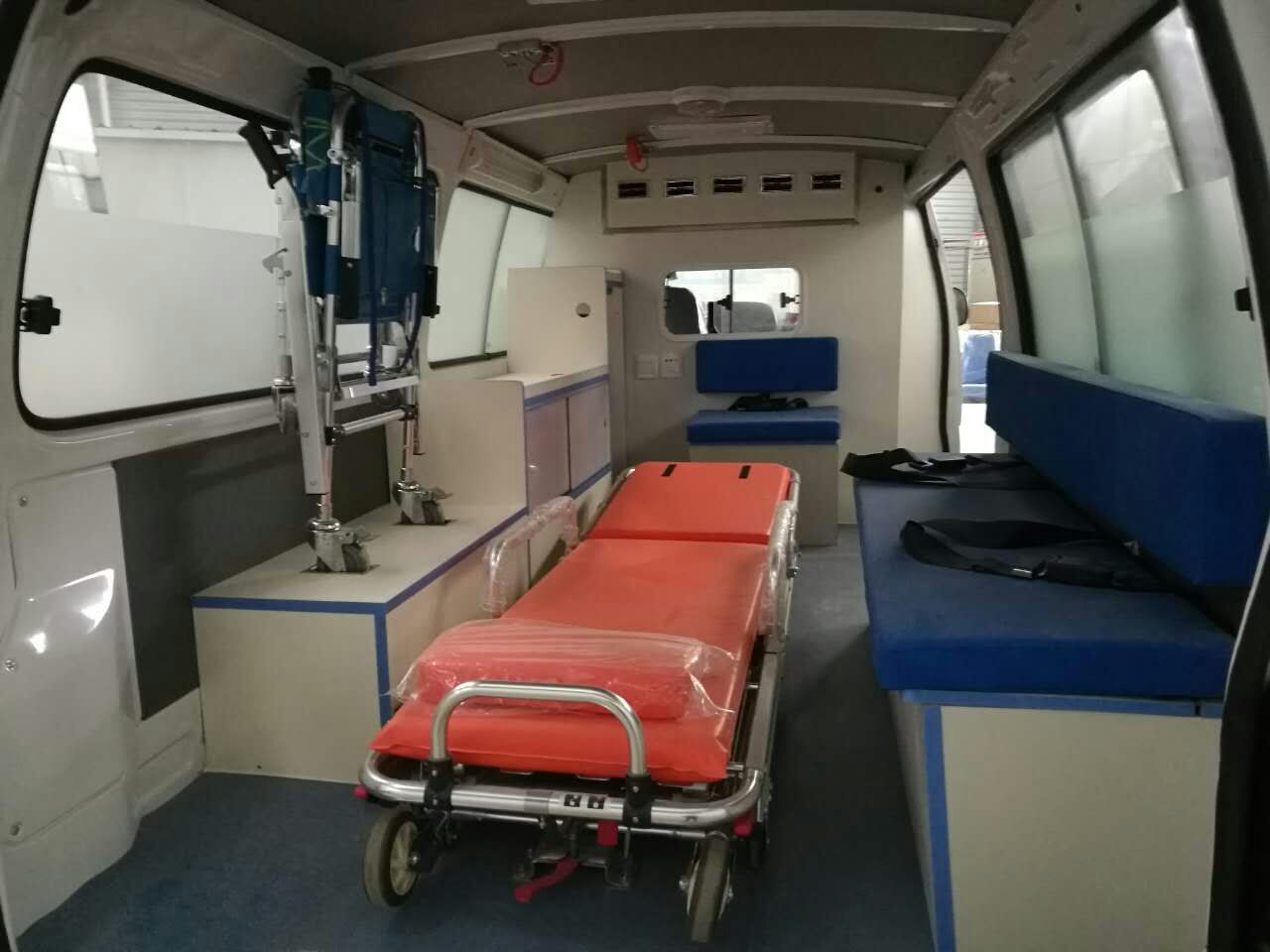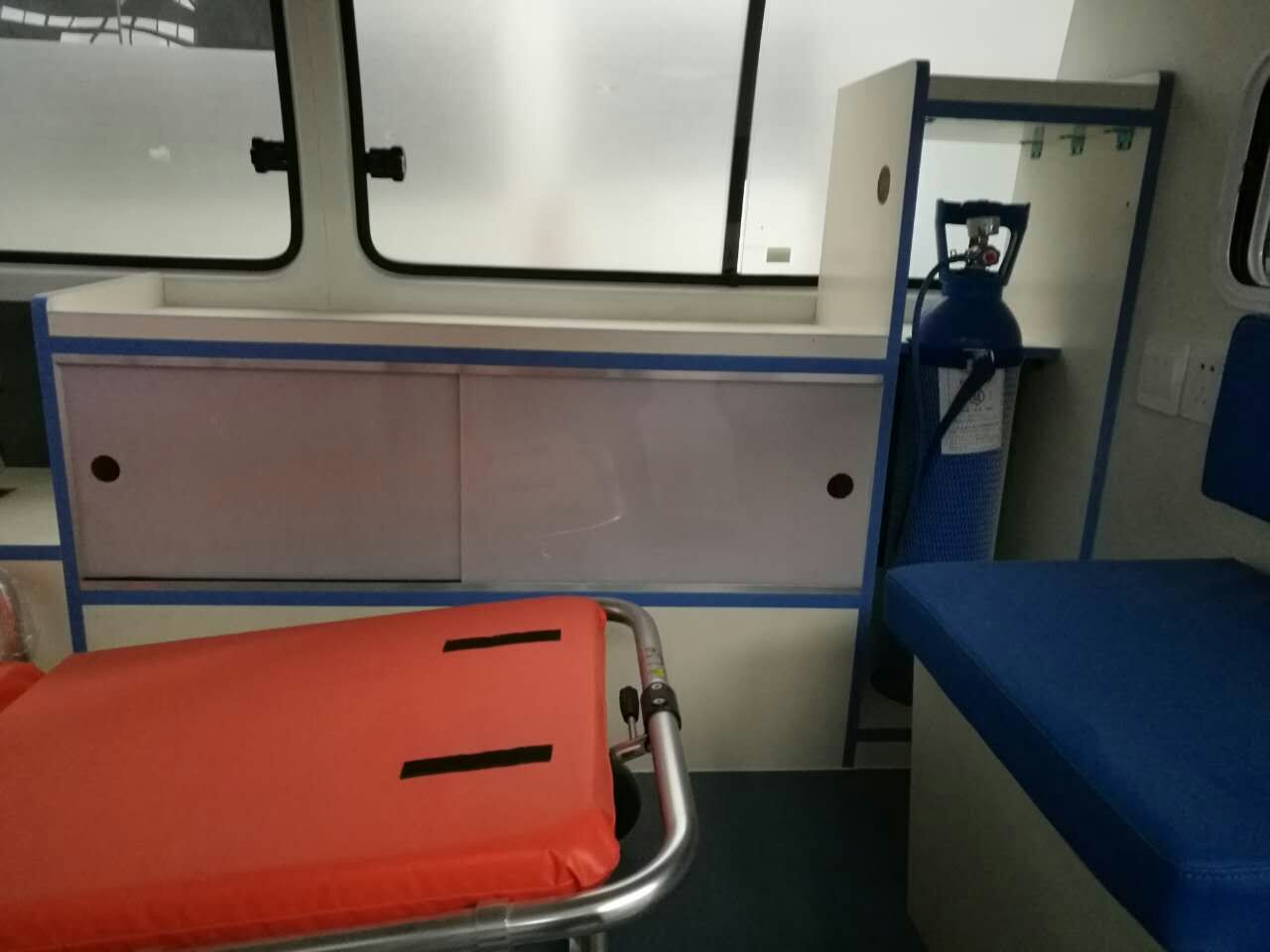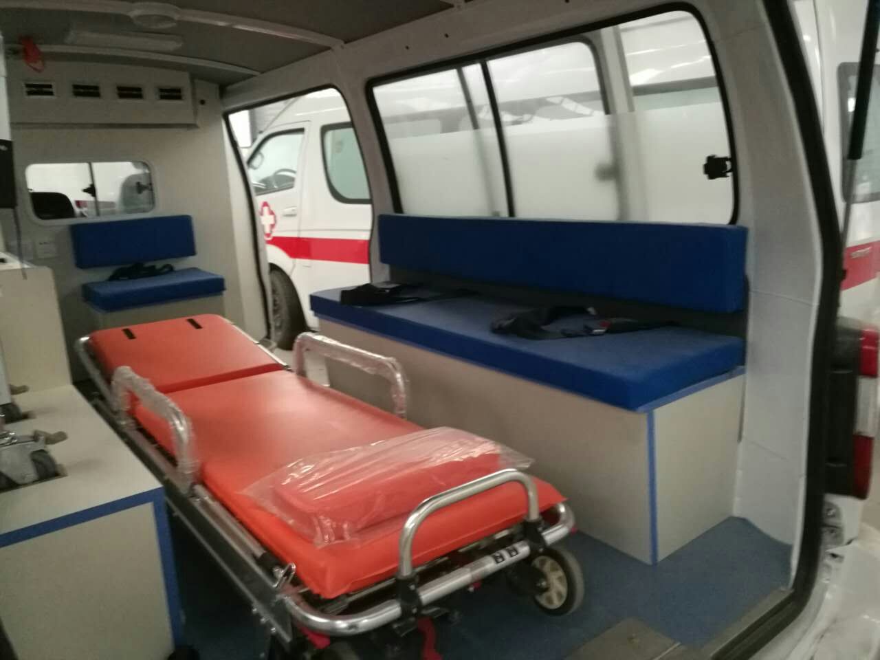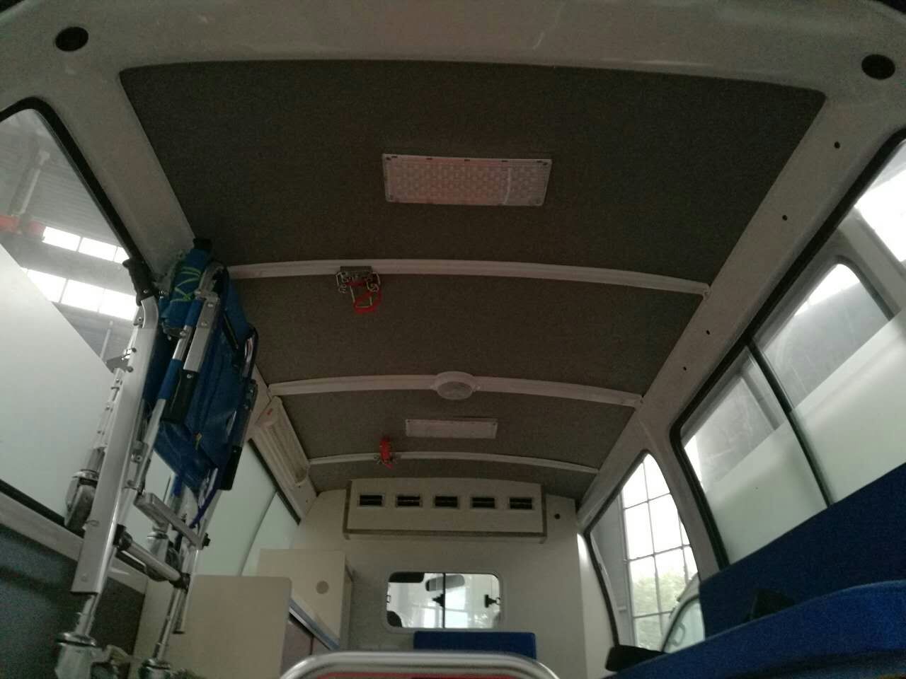1、便攜折疊式擔架1件;2、醫(yī)藥柜1件;3、固定安裝氧氣瓶1只;4、輸液吊鉤2只;5、消毒燈1只;6、污物桶1只;7、單人座椅3只;8、長條貯藏柜帶2人位軟座墊、軟靠背和安全帶1套;9、中隔斷帶鋁合金滑窗1套;10、前頂裝全藍警燈警報器1套;11、照明燈2只;12、逆變器1只;13、電源插座1組;14、中門上車扶手;15、后門上車踏板;16、醫(yī)用耐磨塑膠地板革;17、貼救護十字標志;廠家銷售熱線:13872882215.