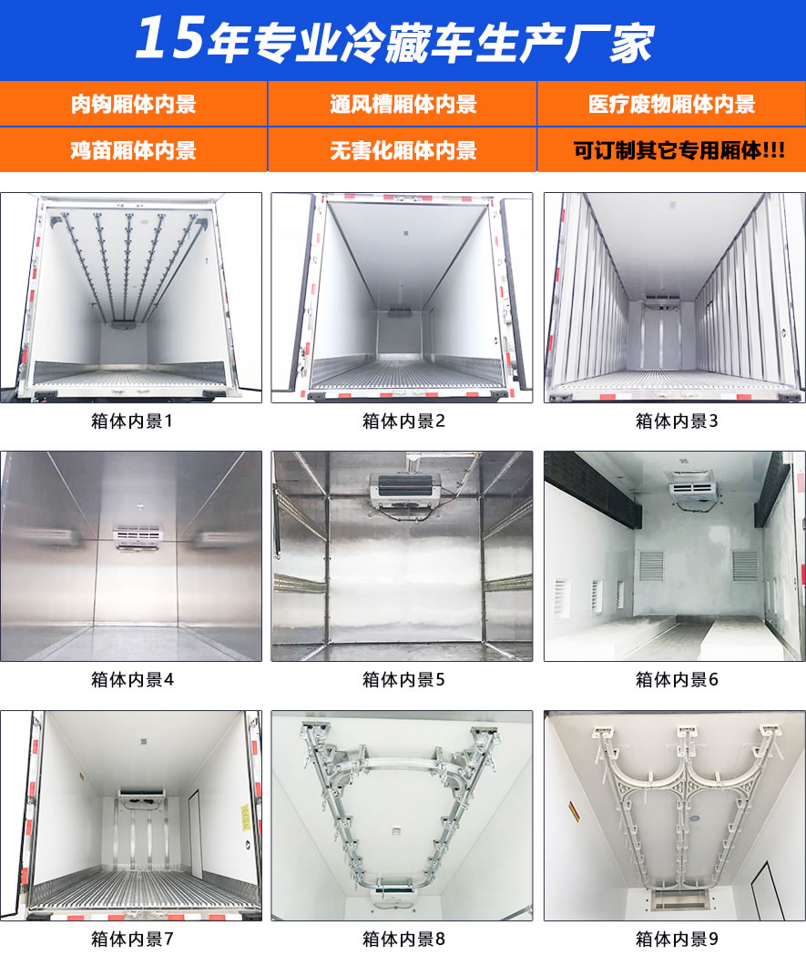 箱體采用三明治結(jié)構(gòu),內(nèi)外采用冷藏車專用玻璃鋼(可反射陽光可選用不銹鋼),中間保溫層采用聚氨酯發(fā)泡隔熱材料,18米罐注一次成型,產(chǎn)品重量輕,漏熱率(導(dǎo)熱系數(shù))低,強(qiáng)度高,保溫效果好,廂體美觀大方扎實(shí)耐用。廂體厚度8CM.廂體全為不銹鋼鎖件,鋁合金包角,廂體可選裝通風(fēng)槽、開側(cè)門等。根據(jù)需要可選裝配國內(nèi)外知名制冷機(jī)組(溫度達(dá)到保鮮或冷凍要求),可根據(jù)您的需求進(jìn)行定制生產(chǎn)。