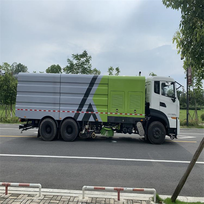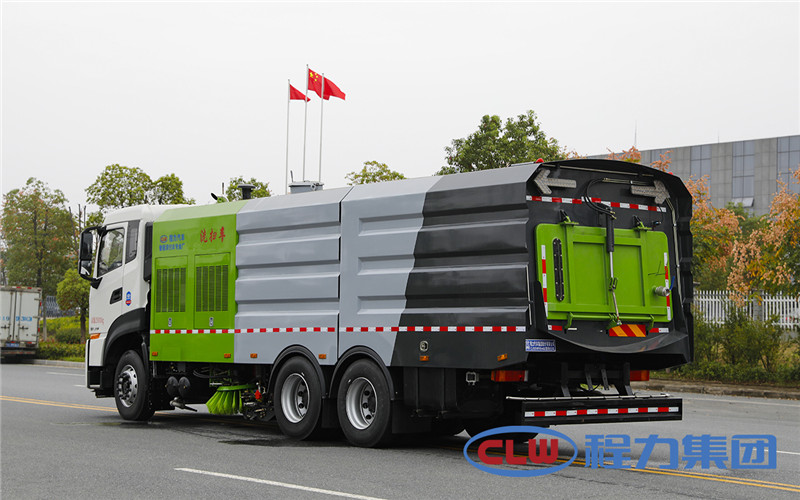 東風(fēng)天龍洗掃車副發(fā)動(dòng)機(jī)驅(qū)動(dòng)風(fēng)機(jī)和高壓水泵,副發(fā)動(dòng)機(jī)采用東風(fēng)康明期6缸柴油發(fā)動(dòng)機(jī)。 風(fēng)機(jī)用8.0高壓離心風(fēng)機(jī),效率高、風(fēng)量大,最高風(fēng)量達(dá)23500m3/h。 東風(fēng)天龍洗掃車高壓水泵采用同際知名T7012IR 型柱塞柱,流量合適,壓力高,允許最高壓力達(dá)10MPa,清水箱充分利用了車載空間,容積大,容積達(dá)12m3。 東風(fēng)天龍洗掃車?yán)洳捎脝螌硬讳P鋼結(jié)構(gòu),傾翻卸料,帶高壓位自潔裝置。自潔裝置可在垃圾箱卸料時(shí)幫助卸料,清洗垃圾箱內(nèi)部。 東風(fēng)天龍洗掃車左右立掃為單掃盤,減少了掃刷數(shù)量和掃刷消耗量,能降低使用成本。左右立掃分開控制,可實(shí)現(xiàn)左掃、右掃和全掃等不同作業(yè)模式。寬吸嘴的吸口寬度達(dá)到2418mm,確保作業(yè)總寬度大于3.5mm。 湖北程力國(guó)六東風(fēng)天龍后雙橋大型洗掃4個(gè)高度可調(diào)的吸嘴輪,能方面調(diào)整和保證吸嘴與路面間的合理間隙。吸嘴內(nèi)高有噴水桿,盡可能多地將高壓洗滌噴嘴布置在吸嘴內(nèi)部,不但清洗效果好,還能最大限度減少高壓水氣流沖起污物產(chǎn)生的二次污染。左右噴水桿安裝在吸嘴上,隨吸嘴升降,結(jié)構(gòu)簡(jiǎn)單緊湊,保證噴水桿的離地高度固定不變,達(dá)到最佳清洗效果。 東風(fēng)天龍洗掃車開式液壓系統(tǒng)驅(qū)動(dòng)左右立掃升降、左右掃肋旋轉(zhuǎn)、吸嘴升降、垃圾箱后門開閉、垃圾箱傾翻復(fù)位等機(jī)械動(dòng)作。底盤變速箱側(cè)取力器驅(qū)動(dòng)低壓水泵,實(shí)現(xiàn)灑水車的低壓沖洗功能。一鍵式作業(yè)起動(dòng)和停機(jī)操作。 東風(fēng)天龍大型洗掃車具有路面清洗、路面清掃、路緣清洗、路緣和路緣石立面洗刷、低壓沖洗、噴霧除塵等多功能。有“全洗掃”、 “左洗掃”、 “右洗掃”、 “全掃”、 “左掃”、 “右掃”6種作業(yè)模式可選擇。選擇“全洗掃”模式清洗廣場(chǎng)和路面,清洗效率高效果好,洗凈率達(dá)90%以上。選擇“左洗掃”或“右洗掃”模式清洗路面和路緣、洗刷路緣石立面。需要進(jìn)行路面清掃或路面保潔作業(yè)時(shí),可選擇掃路模式。需要噴霧除塵時(shí),可開啟噴霧裝置,進(jìn)行噴霧除塵作業(yè)?梢韵駷⑺囈粯訉(duì)路面進(jìn)行低壓沖洗作業(yè)。 東風(fēng)天龍大型洗掃車適用于城市道路、高速公路、廣場(chǎng)、機(jī)場(chǎng)、碼頭、遂道、橋梁、隔離墻避、路緣和路緣石立面的機(jī)械化清洗、清掃、噴霧降塵等清潔作業(yè)。